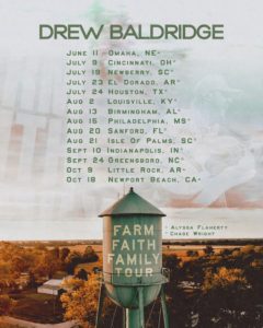 Country hitmaker Drew Baldridge has announced his upcoming headline run, the Farm Faith Family Tour, with tickets available now at drewbaldridgemusic.com.