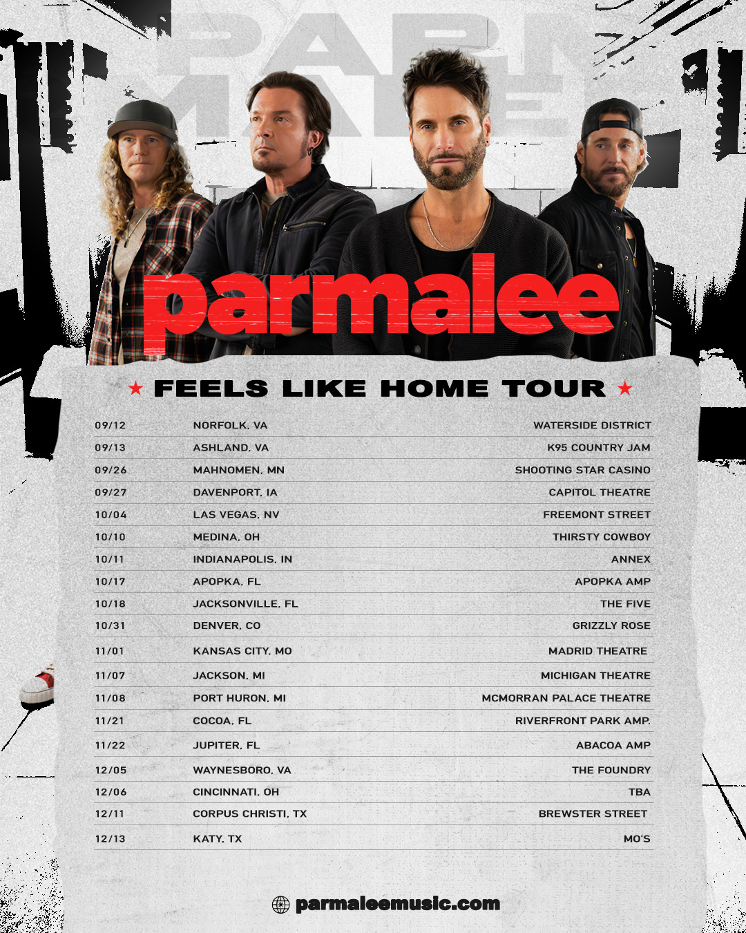 Named after the band’s anthemic fan-favorite track “Feels Like Home” off their latest album Fell In Love With A Cowgirl — the tour – like the song – will deliver triumphant, sing-along choruses, perfectly capturing the nostalgic, feel-good energy fans expect at a Parmalee show.